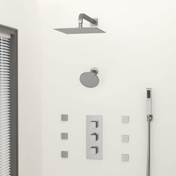 Thermostatic Triple Handles 8-Spray Dual Shower Head Shower Faucet with 6-Jets in Brushed Nickel (Valve Included)
