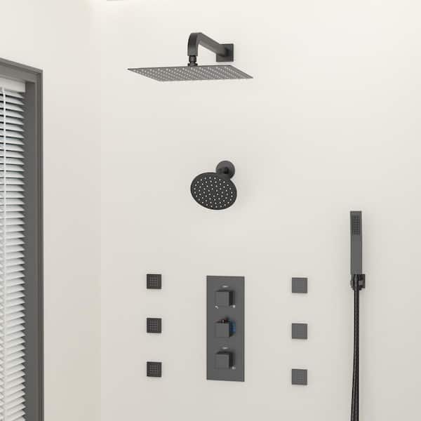 Thermostatic Triple Handles 8-Spray Dual Shower Head Shower Faucet with 6-Jets in Matte Black (Valve Included)