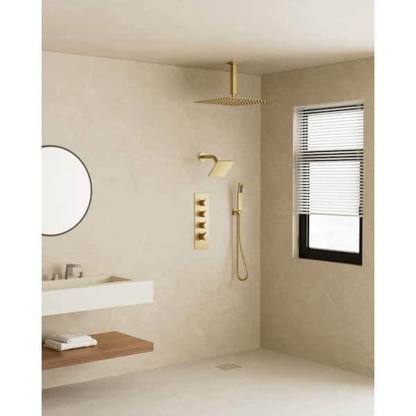 Thermostatic Valve 7-Spray 16 in. and 6 in. Dual Ceiling Mount Shower Head and Handheld Shower in Brushed Gold
