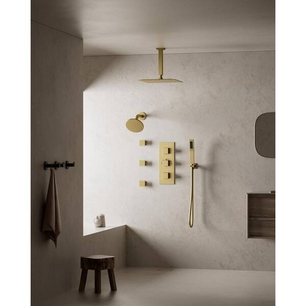 Thermostatic Valve 8-Spray 12 in. and 6 in. Ceiling Mount Dual Shower Head and Handheld Shower in Brushed Gold
