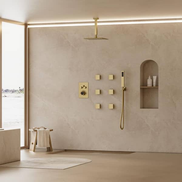 Triple Handles 7-Spray Patterns Shower Faucet 12 in. Shower Head with 6-Jets in Brushed Gold (Valve Included)