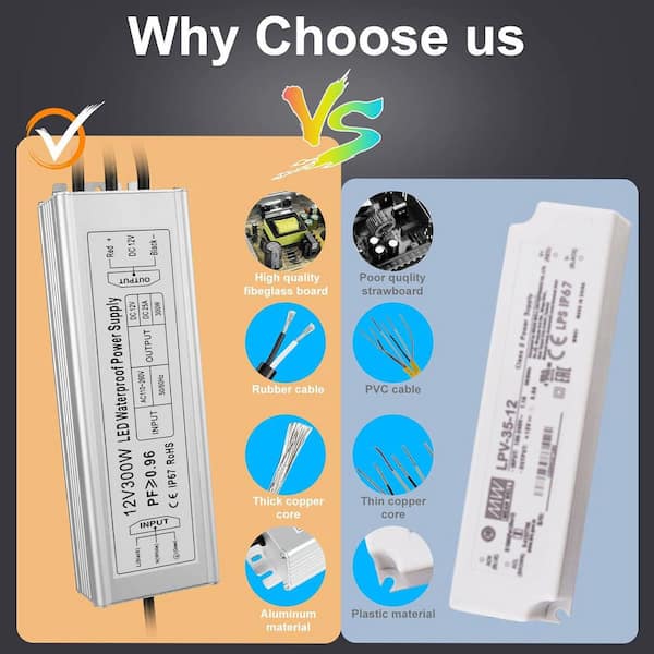 12V 300W Power Supply AC 110-260V to DC 12V 25A Converter IP67 Waterproof Transformer LED Driver Outdoor Use