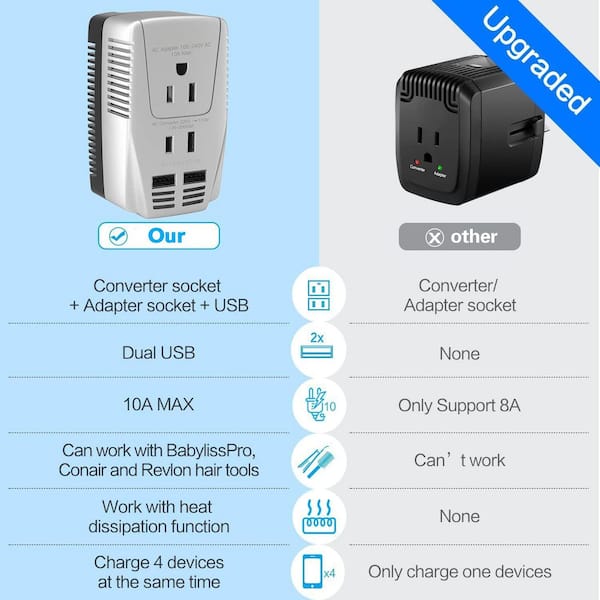 2000W Pipe Capacity Voltage Converter 220V to 110V Travel Adapter with 2-Port USB Power Converter for US/UK/EU Plug Gray
