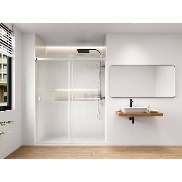 Fluted / Reeded Glass 60 in. W x 79 in. H Double Sliding Frameless Bath Shower Door in Brushed Nickel