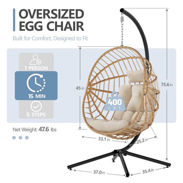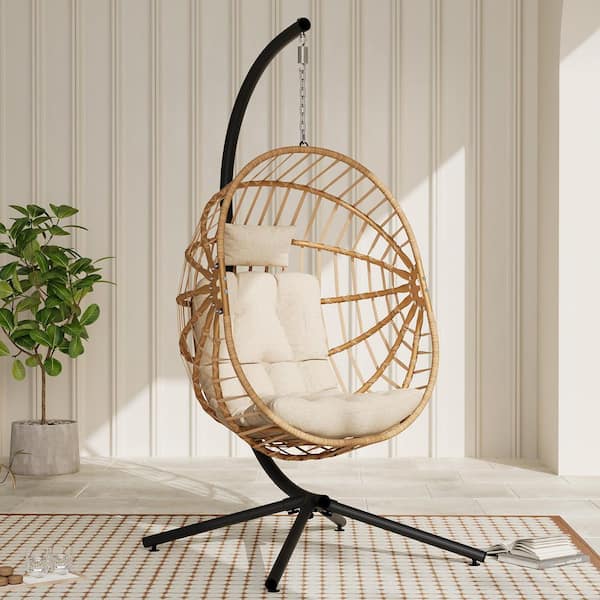 1-Person Wicker Patio Swing Egg Chair with Stand and Beige Cushion