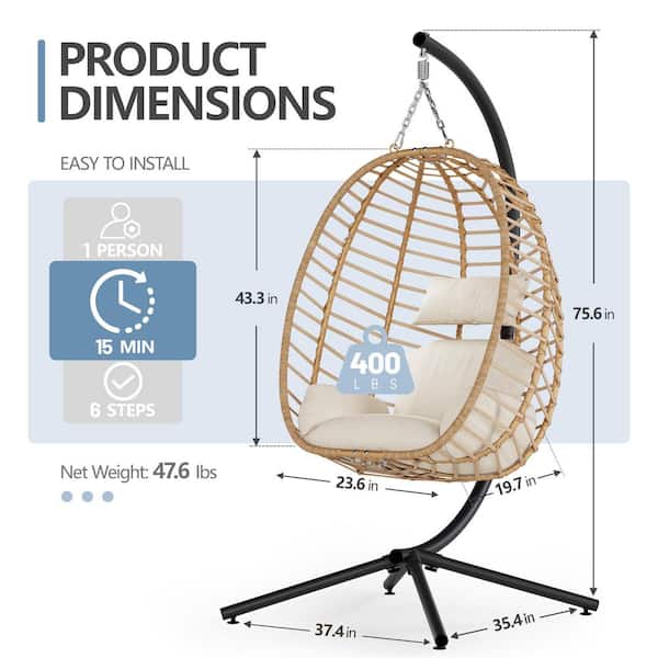 1-Person Wicker Patio Swing Egg Chair with Stand and Beige Cushion