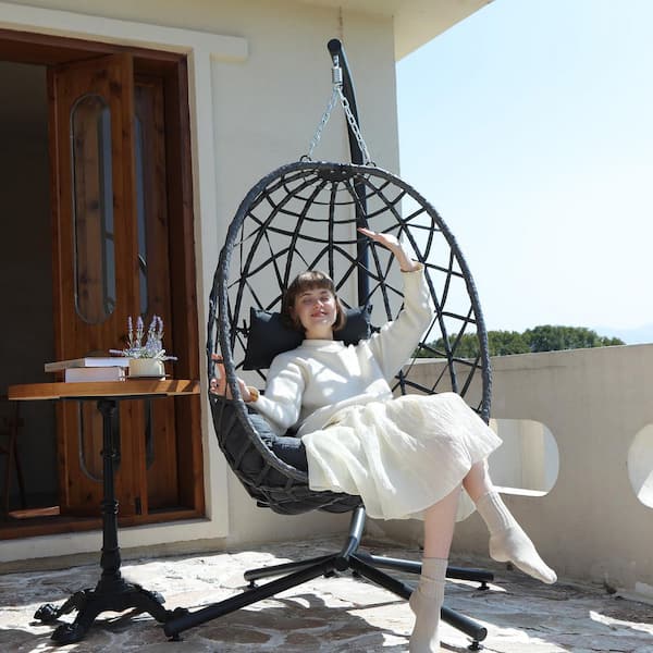 1-Person Wicker Patio Swing Egg Chair with Stand and Gray Cushion