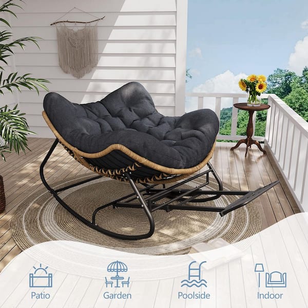 Oversized PE Wicker Outdoor Rocking Chair with Footrest and Gray Cushion