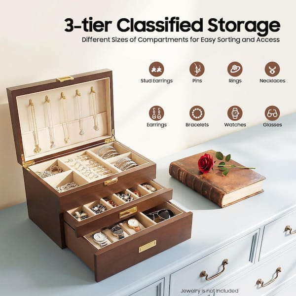11 in. x 7.1 in. 3 Layer Jewelry Organizer Box for Storage Earrings Rings Necklace Bracelet