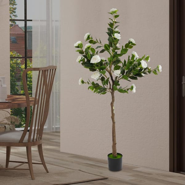 4.9 ft. Artificial Tree Artificial Camellia Tree in Pot Outdoor Indoor Decor (White Flower)