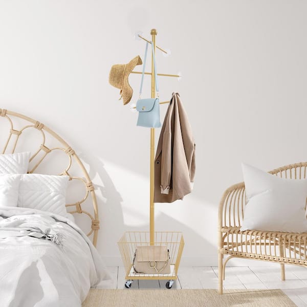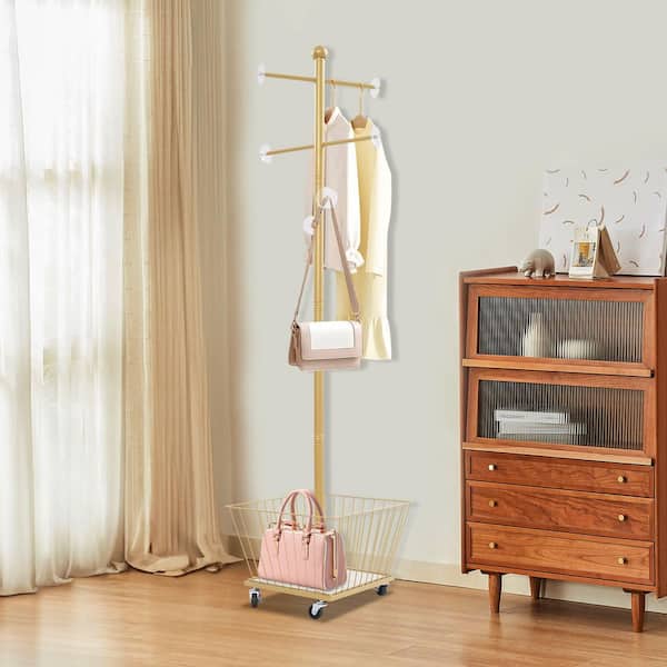 Gold 66 in. Tall Metal Carbon Steel Free Standing 6 Hooks Coat Rack with Wheels and Storage Basket
