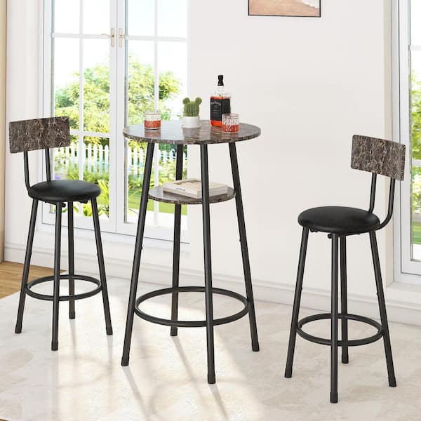 3-Piece Round Elegant Brown MDF Wood Top Bar Table Set with 2 PU Soft Seat, Small Space Dining Table Set Seats 2