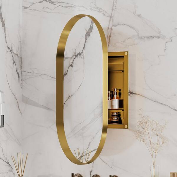 20 in. W x 34 in. H Oval Gold Metal Surface Mount Medicine Cabinet with Mirror, with Adjustable Shelves