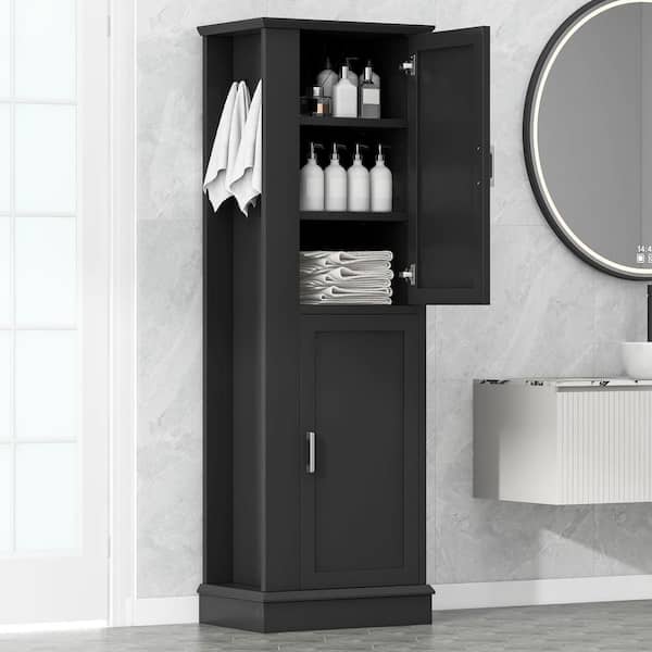 21 in. W x 14 in. D x 68 in. H Freestanding Black Linen Cabinet with Hook and Adjustable Shelf