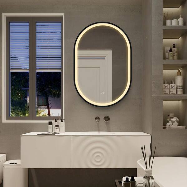 21 in. W x 31 in. H Oval Iron Surface Mount Medicine Cabinet with Mirror LED Light in Black