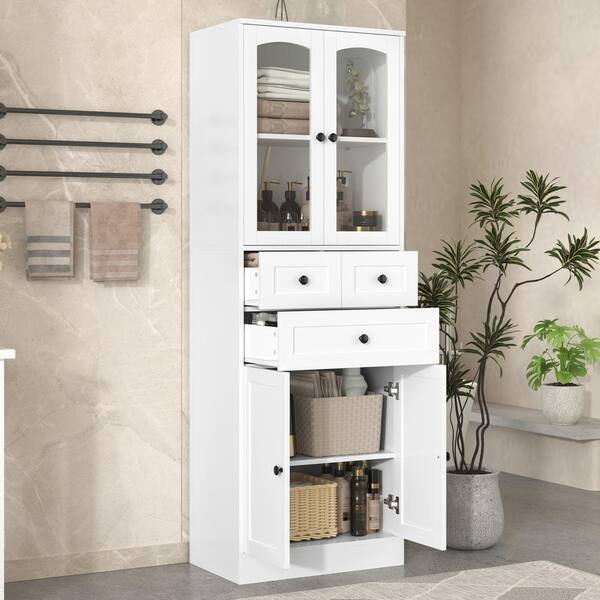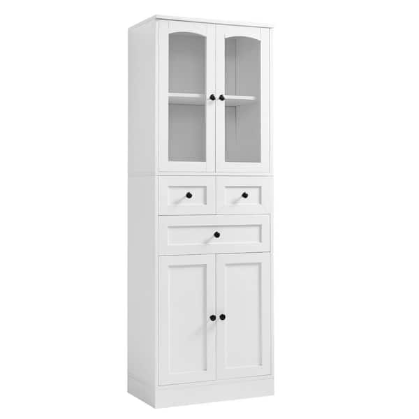 23 in. W x 14 in. D x 67 in. H White MDF Freestanding Linen Cabinet with Glass Door, 3 Drawers