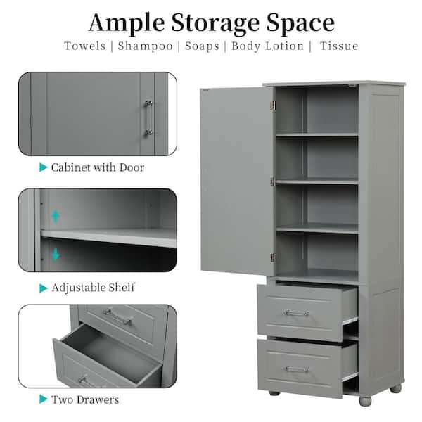 23 in. W x 16 in. D x 61 in. H Freestanding Gray Linen Cabinet with Door Anti-Tip, Three-layer Open Shelf