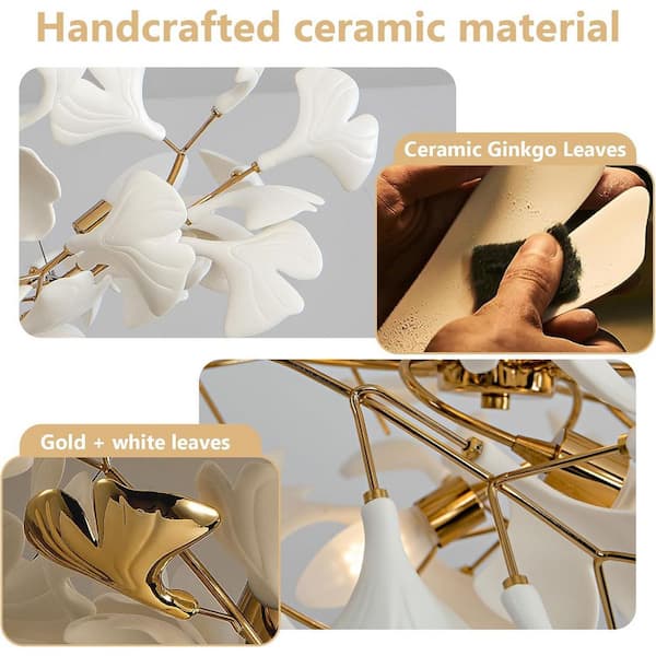 10-Light Gold Chandelier, Luxury Ceramic Ginkgo Branch Chandelier for Living Room, Dining Room, Kitchen Island-L59 in.