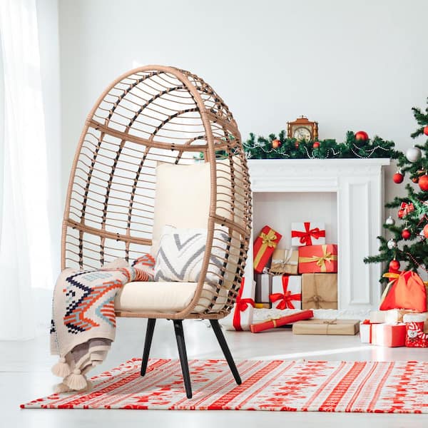 Egg Chair Wicker Outdoor Indoor Lounge Chair with Beige Cushion and Stand for Bedroom, Balcony (1-Pack)
