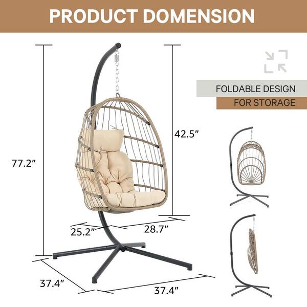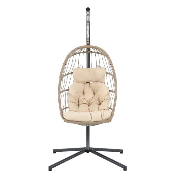 Outdoor 1-Person Wicker Egg Swing Chair with Stand, Porch Swing Foldable Hammock Chair for Garden Beige