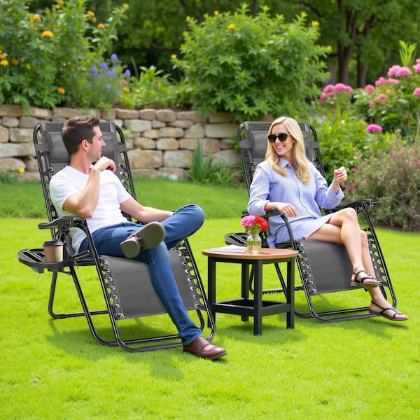 Patio Black Metal Folding Beach Chair Zero Gravity Chairs with Cup Holder Trays (Set of 2)