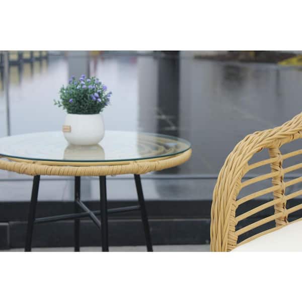 Yellow 3-Pieces Outdoor Patio Balcony Natural Wicker Chair Table Set with Beige Cushion and Tempered Glass Table Top