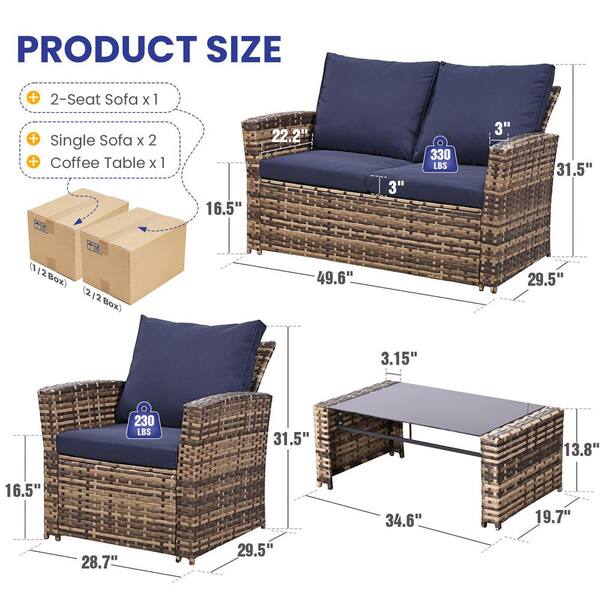 Yellow 4-Piece Wicker Outdoor Sofa Sectional Set Conversation Set with Blue Cushions and Tempered Glass Table