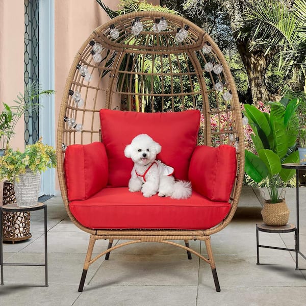 Yellow Patio Wicker Egg Chair with Cushion, Oversized Indoor Outdoor Lounger for Patio, Living Room with Red Cushion