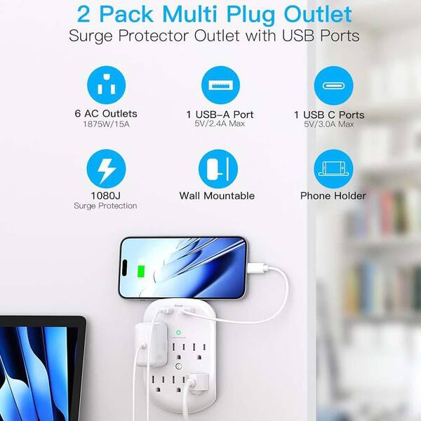 2 Pack 6-Outlet Multi Plug Wall Adapter with 2 USB-A Ports 1 USB-C Port Surge Protector for Home Office Dorm Room