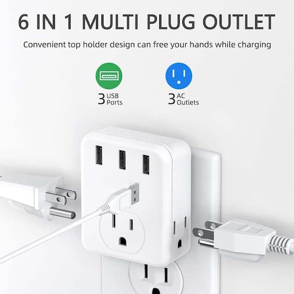 3-Outlet Splitter 3 USB Ports Multi Plug Extender Wall Charger 3-Side Wall Tap for Home, Office in White