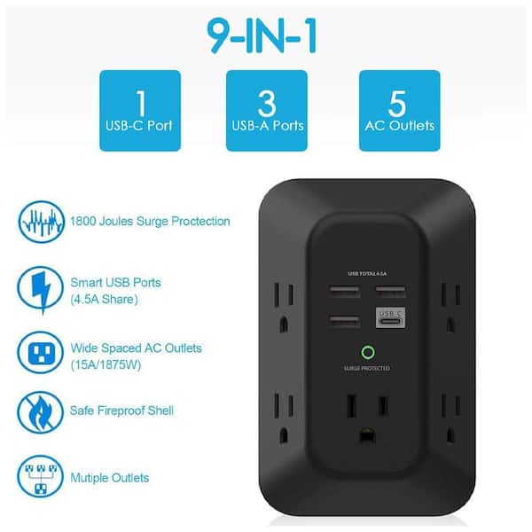 5-Outlet Extender Wall Charger with 4-Ports USB A, 1-Port USB C, Surge Protector, 3-Sided, 1800J, Black