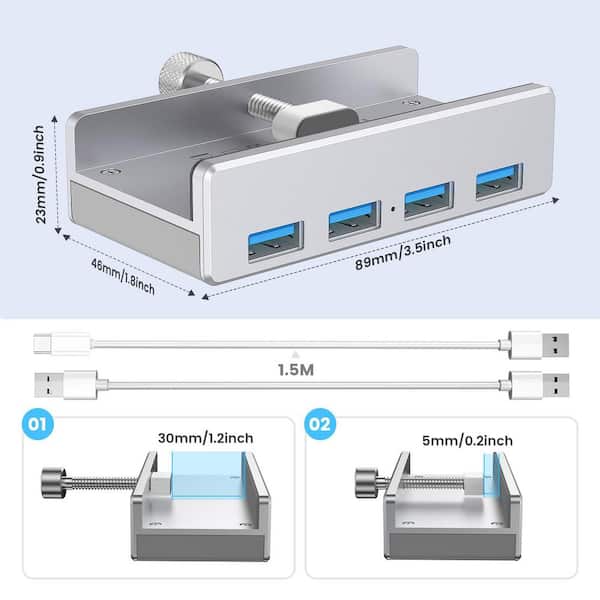Aluminum 4-Port USB Splitter in Silver with Extra Power Supply Port and 4.92 ft. USB A to USB A for Monitors