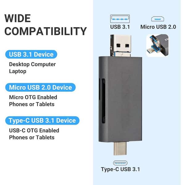 Micro SD 4.0 Card Reader Adapter, 3-in-1 USB-A 3.1 USB-C 3.1 Micro USB 2.0 Connection Port, High Transfer Speed
