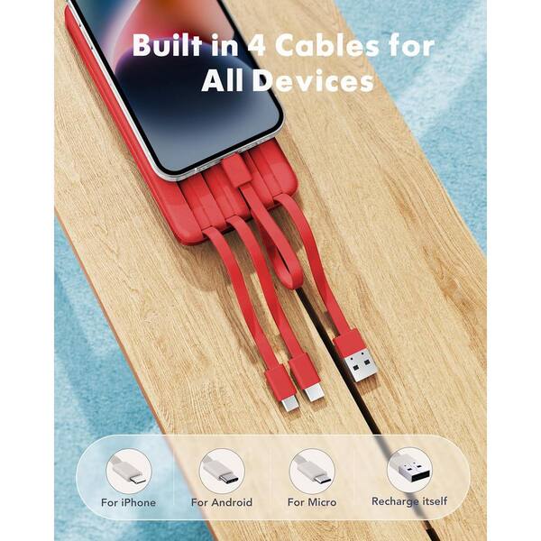 Portable Charger Built in Cables Portable Charger with Cords Wires Slim 10000mAh Travel Battery Pack 6 Outputs (Red)