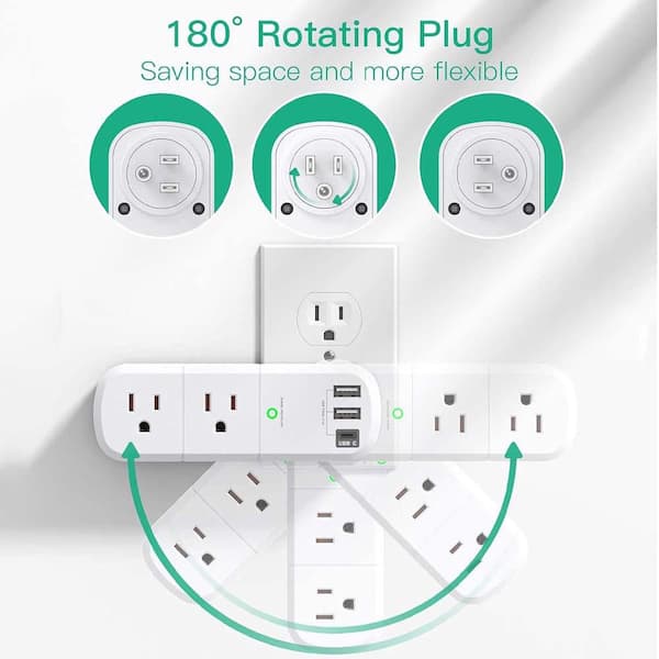 Rotating Plug Surge Protector 6-Outlet 2-Ports 1-Ports with 1800 Joules 3-Sided Splitter USB Extender for Travel