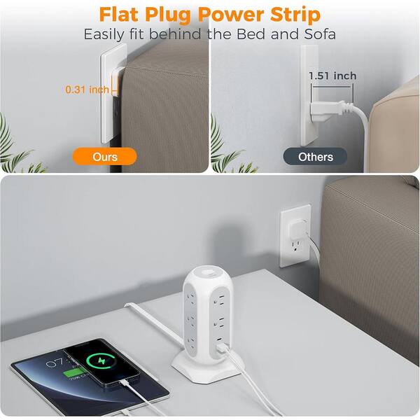 Tower Power Strip Flat Plug 6 ft. with 11 Outlets 3 USB Surge Protector Tower Protection with Multiple Outlets