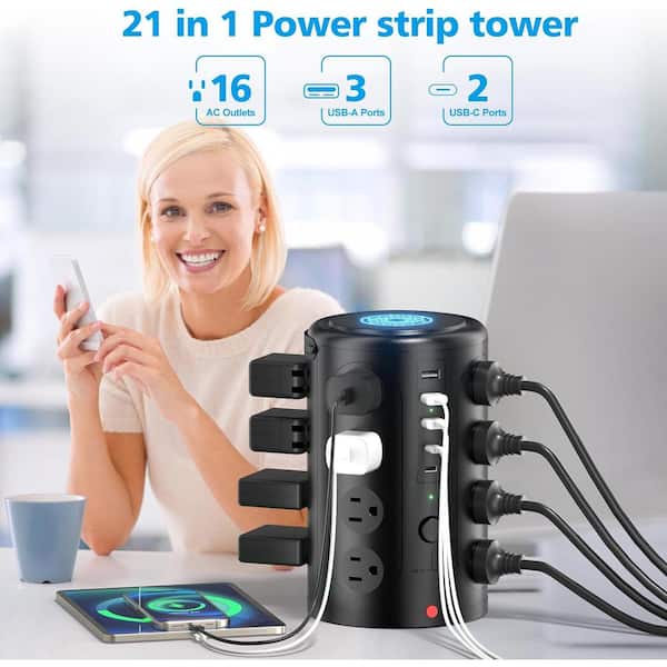 Tower Power Strip Surge Protector with 16 Outlets and 5 USB Ports 6 ft. Extension Cord with Multiple Outlets in Black