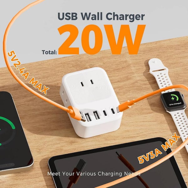 USB C Charger Block, Wall Charger Plug with 3 AC and 4 USB Charging Ports, 2 Prong Outlet Extender in White