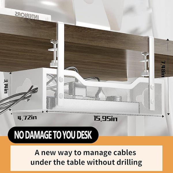 Under Desk Cable Management Tray No Damage to Desk Standing Desk Cord Organizer Easy Install White 15.95 in.