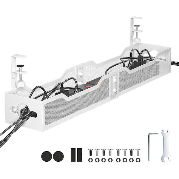 Under Desk Cable Management Tray in White No Drill 25'' Metal Cable Tray with Clamp Wire Organizer Black