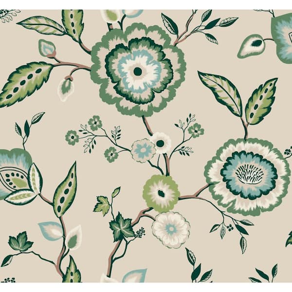 Dahlia Blooms Linen/Jade Multi-Colored Matte Pre-pasted Paper Wallpaper 60.75 sq. ft