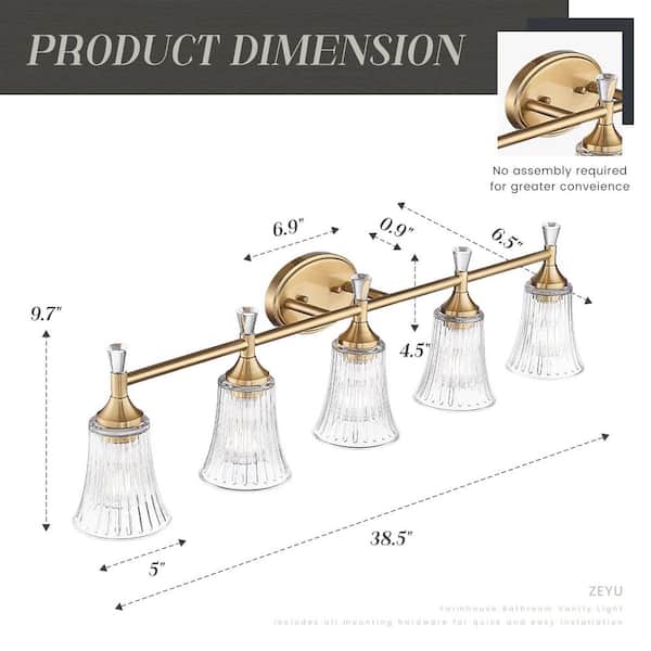38 in. Modern 5-Light Gold Finish Vanity Lighting Fixtures with Bell Shaped Fluted Glass