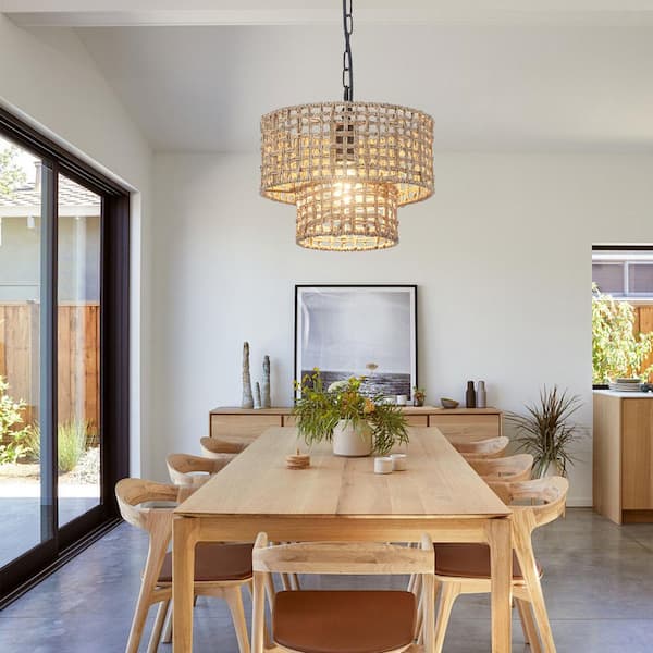 1-Light Drum Black Hanging Ceiling Pendant Light Linear Chandelier with Rattan Shaded for Kitchen Island