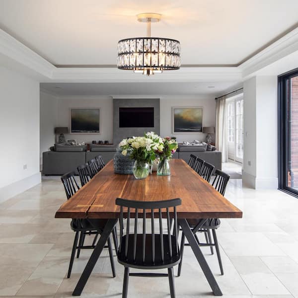 12.59 in. 3-Light Black and Golden Round Drum Semi-Flush Mount Ceiling Light with Clear Crystal and No Bulbs Included