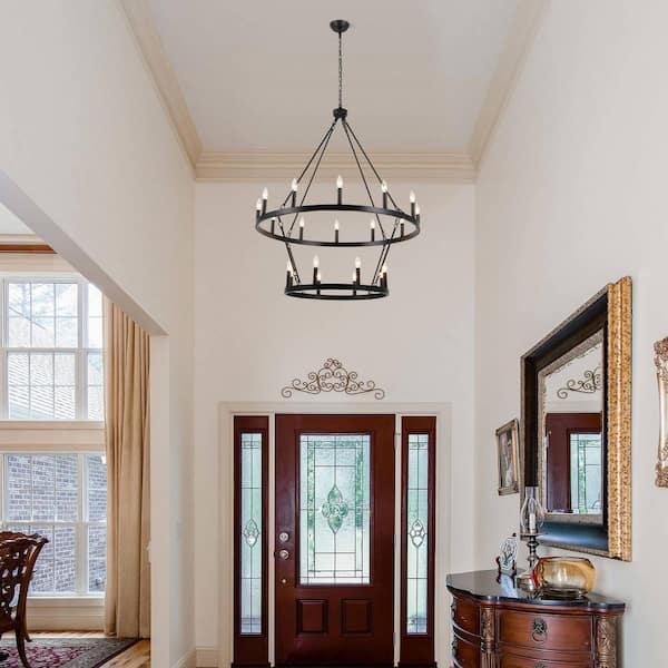 12 Plus 8-Light Matte Black Classic Wagon Wheel Chandelier for Living Room Dinning Room with No Bulbs Included