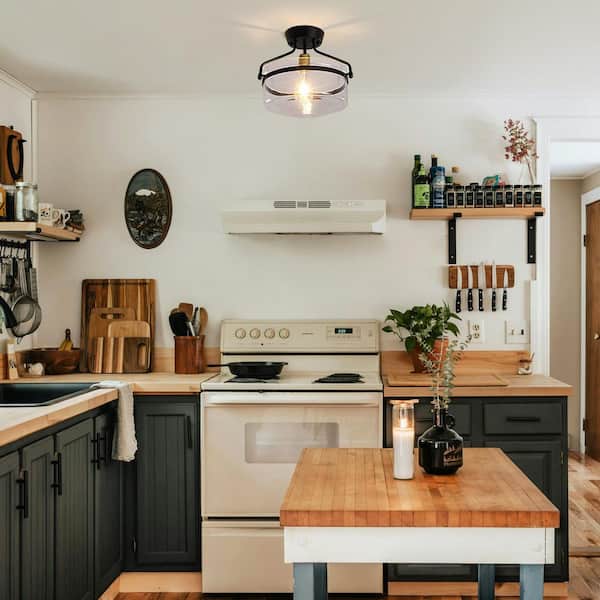 13.3 in. 1-Light Black Modern Semi-Flush Mount Ceiling Light with Glass Shade