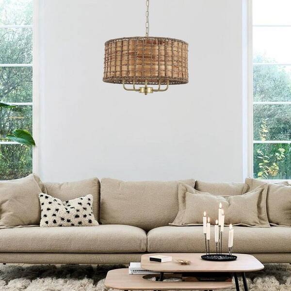 18.8 in. 5-Light Golden Drum Chandelier with Seagrass and Water Hyacinth Shade and No Bulbs Included