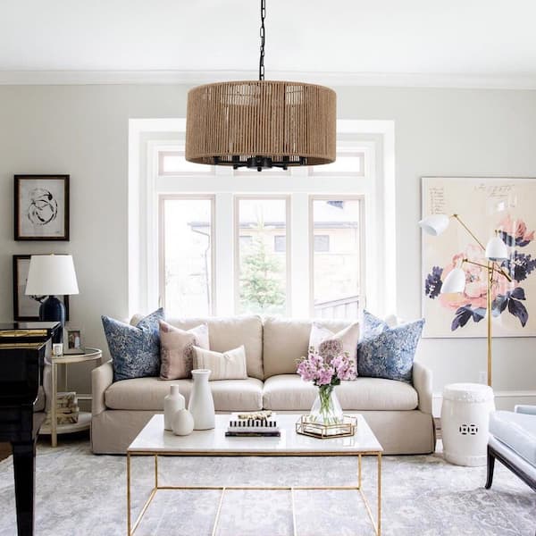 19.2 in. 5-Light Matte Black Natural Design Drum Chandelier with Hand Made Rattan Shade and No Bulbs Included