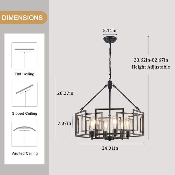24.01 in. 6-Light Matte Black/Wood Grain Drum Chandelier with Metal Splicing Shade and No Bulbs Included For Foyer