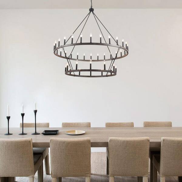 28+12-Light Matte Black/Wood Grain 2 Tier Wagon Wheel Chandelier for Living Room Foyer with No Bulbs Included